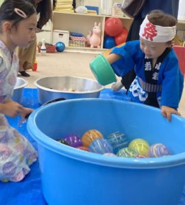 遊びコーナーは、キラキラカップたおし、輪投げ、ヨーヨー釣り、すくいどり、ボーリング。プレゼントで、くじ引きもありました!