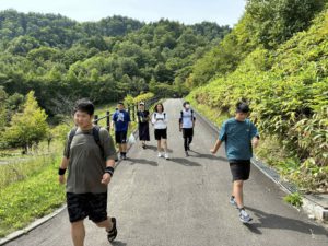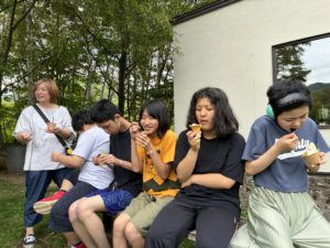 折り返し地点では水と仲良くなり大喜び、川に入り、焼きマショマロを食べて。焼く前から食べる方もいましたが、笑いながらの一日になりました。