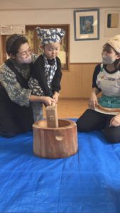 『もちつき』では、子どもたち一人一人が杵を持ち、「よいしょ!」の掛け声に合わせて、自分の力で、もしくは大人と一緒に安心して、おもちをついていました。とっても力強い子どもたちでしたよ!