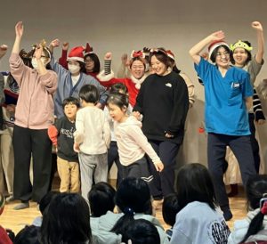 クリスマス会が始まり、最初は年中さんのお母さんによる「ジャンボリーミッキー」です!年中さんの子どもは、一緒に前に出て踊ったりなどみんなで楽しんで参加していました!