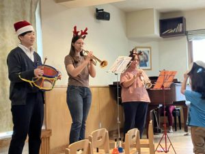 次の軽音部の演奏では、普段みたことのない楽器や知っている先生がいると子ども達は嬉しそうな様子で「山の音楽家」や「あわてんぼうのサンタクロース」を歌うことが出来ました!
