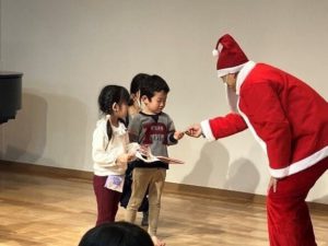 そして、いよいよ子ども達が楽しみにしていたサンタさんが来てくれました。サンタさんが来ると子ども達は目を輝かせて「サンタさーん」と大きな声で呼んでいて、素敵な笑顔でした。プレゼントをサンタさんから受け取る時には「ありがとう」と伝える場面がありました。受け取る時の子ども達、とっても良い表情でした♪